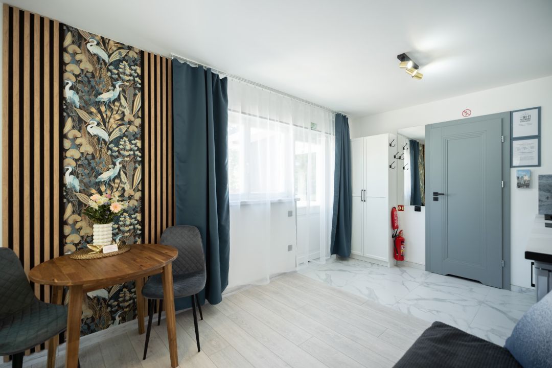 Studio dzīvoklis ar skatu uz iekšpagalmu atrodas ēkas otrajā stāvā. Dzīvoklī atradīsiet Queen izmēra (160 x 200 cm) divguļamo gultu un divvietīgo dīvāngultu (140x200cm). Vannasistaba ir aprīkota ar dušu, vannasistabas piederumiem. Virtuvē ir mikroviļņu krāsns, indukcijas plīts virsma, leduskapis ar nelielu saldētavu, elektriskā tējkanna, gatavošanai nepieciešamie trauki (t.sk. katli un panna), vīna glāzes un kafijas aparāts.