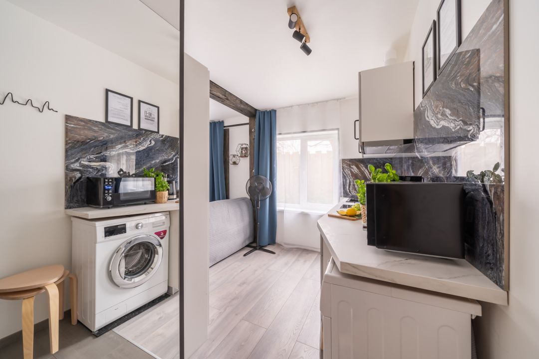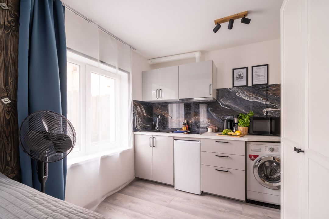 Studio dzīvoklis ar skatu uz iekšpagalmu ”KALNI” atrodas ēkas pirmajā stāvā. Dzīvoklī atradīsiet Queen izmēra (160 x 200 cm) divguļamo gultu un divvietīgu izvelkamo dīvāngultu. Vannasistaba ir aprīkota ar dušu, vannasistabas piederumiem. Virtuvē ir mikroviļņu krāsns, indukcijas plīts virsma, leduskapis ar nelielu saldētavu, elektriskā tējkanna, gatavošanai nepieciešamie trauki (t.sk. katli un panna), vīna glāzes un kafijas aparāts.