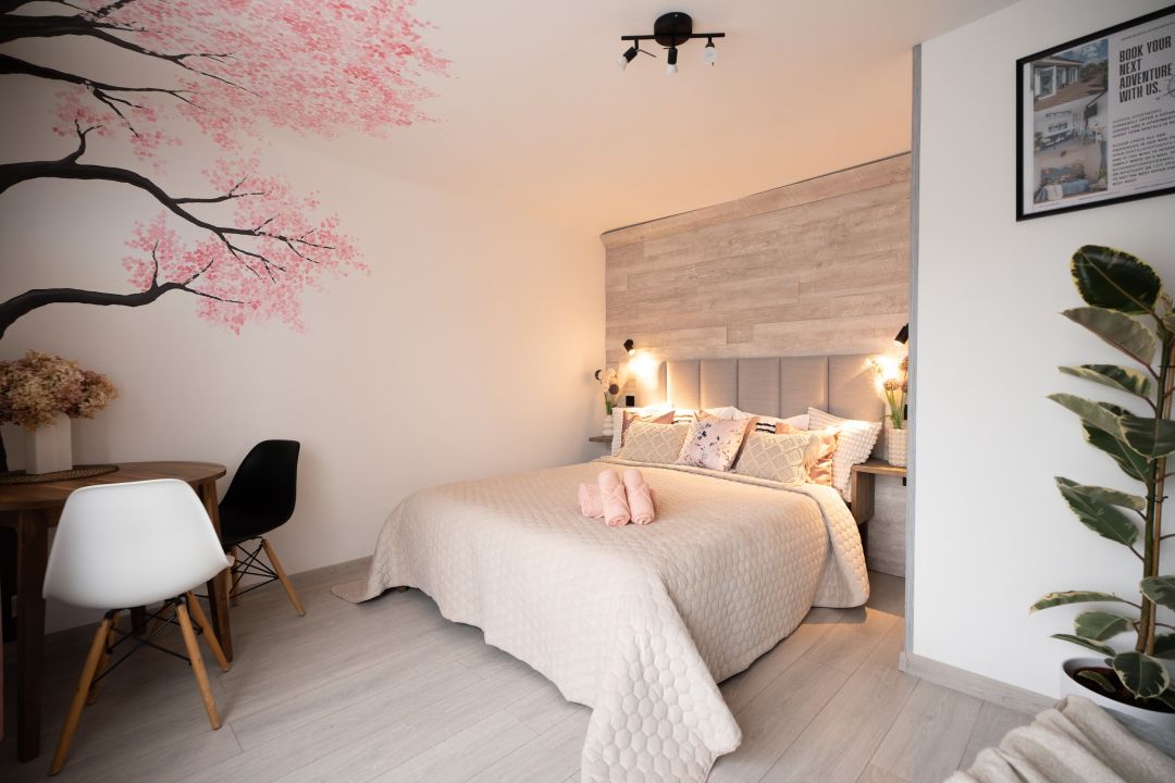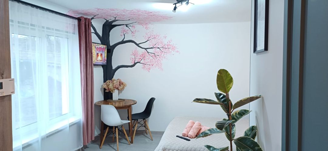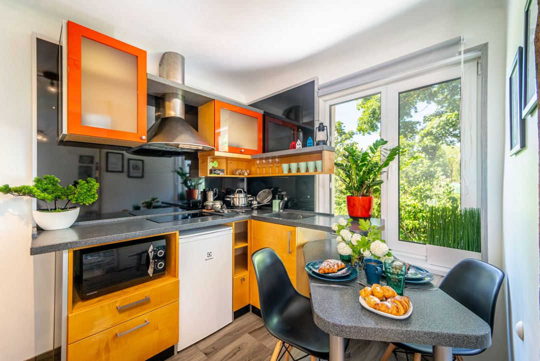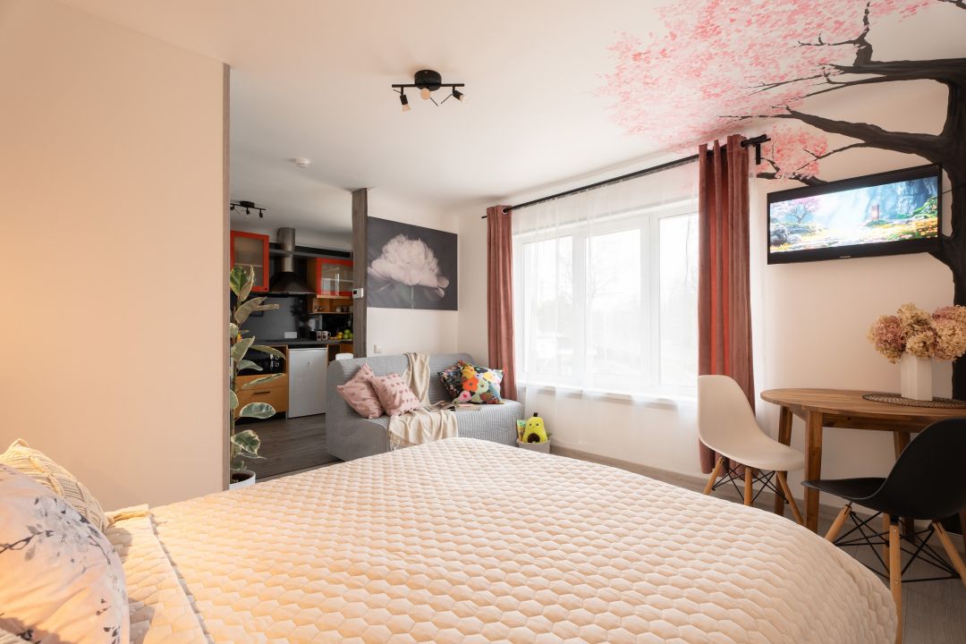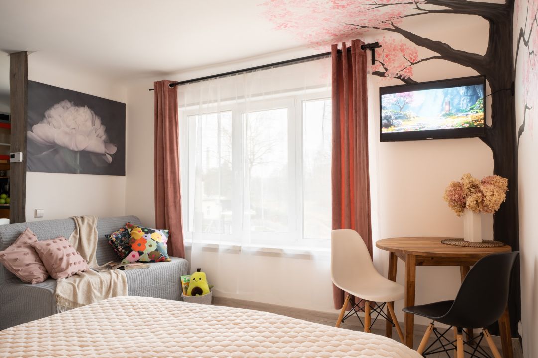 Studio apartment with the view to inner yard and garden ”FLOWERS” is located on the second floor of the building. The apartment will have a queen-size bed and a double sofa bed (140×200). The bathroom is equipped with a shower and toiletries. The kitchen has a microwave, induction hob, fridge with a small freezer, an electric kettle, cooking utensils (including pots and pans), wine glasses and coffee machine.